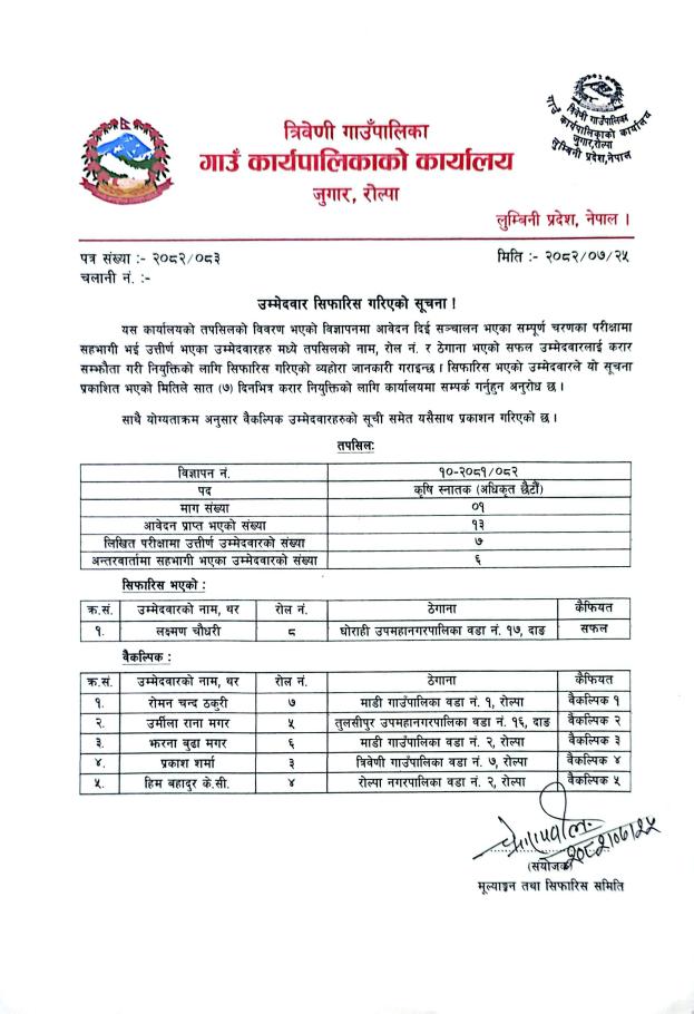 » उम्मेदवार सिफारिस गरिएको सूचना (कृषि स्नातक)