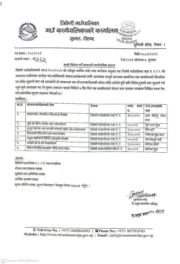 त्रिवेणी गाउँपालिका स्थित त्रिवेणी सिवाङ दोभान खोलाबाट संकलन गरी भण्डारण अवस्थामा रहेको ढुङ्गा, गिट्टि तथा वालुवाको लिलाम विक्रि सम्बन्धी सूचना