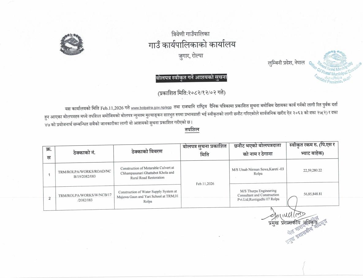 » बोलपत्र स्वीकृत गर्न आशयको सुचना