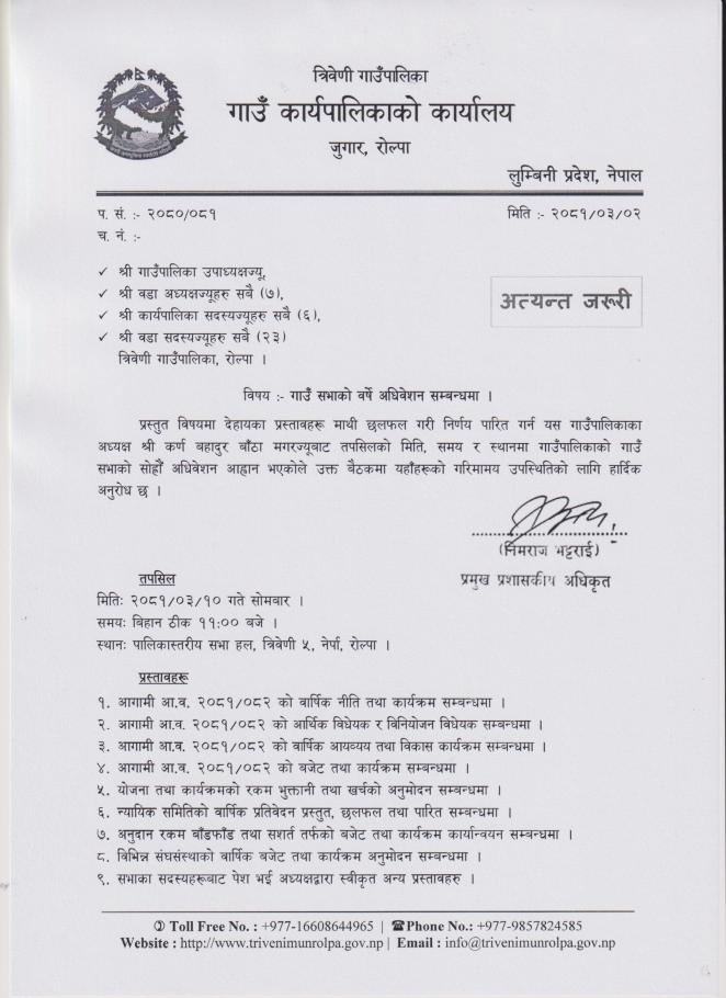 गाउँ सभाको बैठक आह्वान गरिएको सम्बन्धमा ।