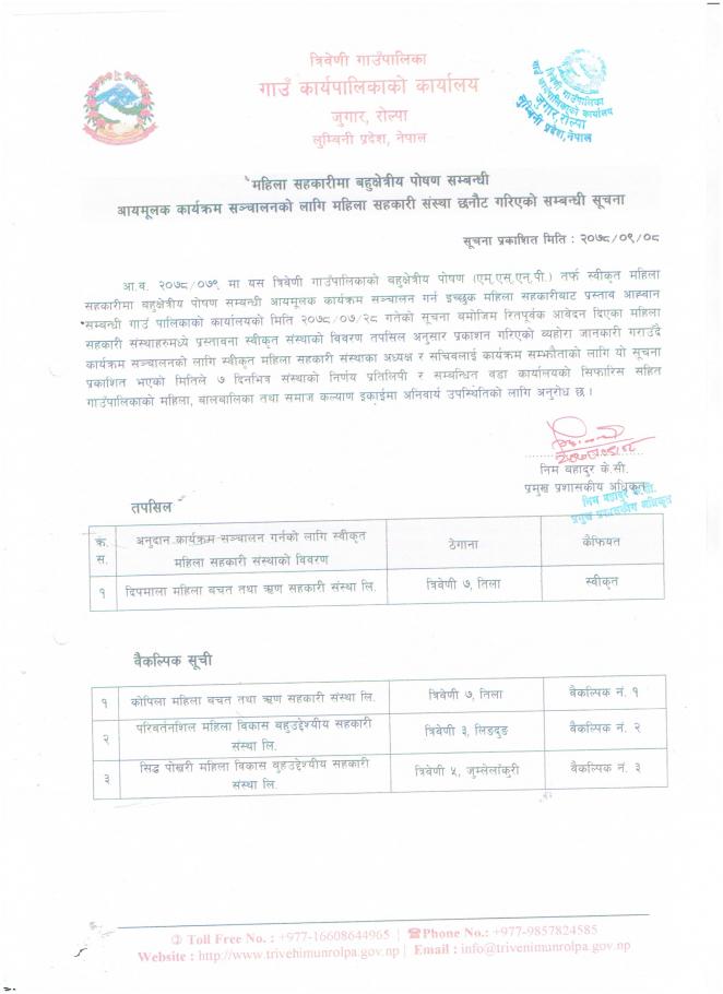 महिला सहकारीमा बहुक्षेत्रीय पोषण सम्बन्धि आयमूलक कार्यक्रम सञ्चालनको लागि महिला सहकारी संस्था छनौट गरिएको सम्बन्धि सूचना ।