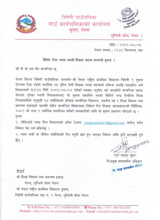 रिक्त पदमा स्थायी शिक्षक सरुवा सम्बन्धी सूचना - नेपाल राष्ट्रिय प्रा.वि.