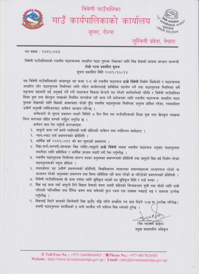 » विज्ञ सेवाको प्रस्ताव आह्वान सम्बन्धी दोस्रो पटक प्रकाशित सूचना !
