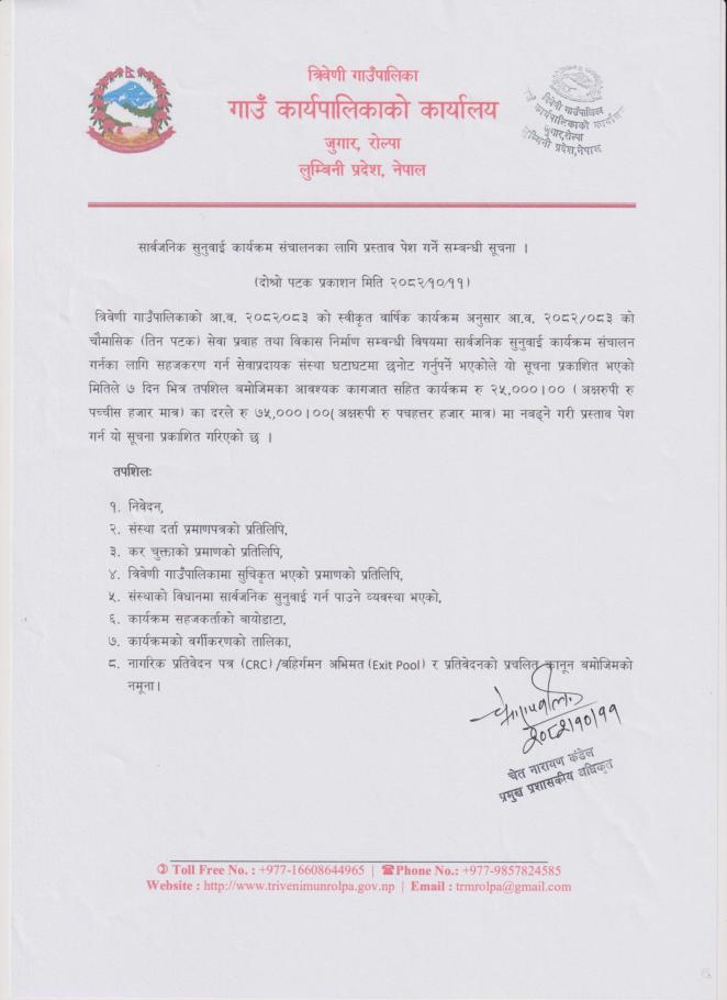 सार्वजनिक सुनुवाई कार्यक्रम सञ्चालनका लागि प्रस्ताव पेश गर्ने सम्बन्धी सूचना !