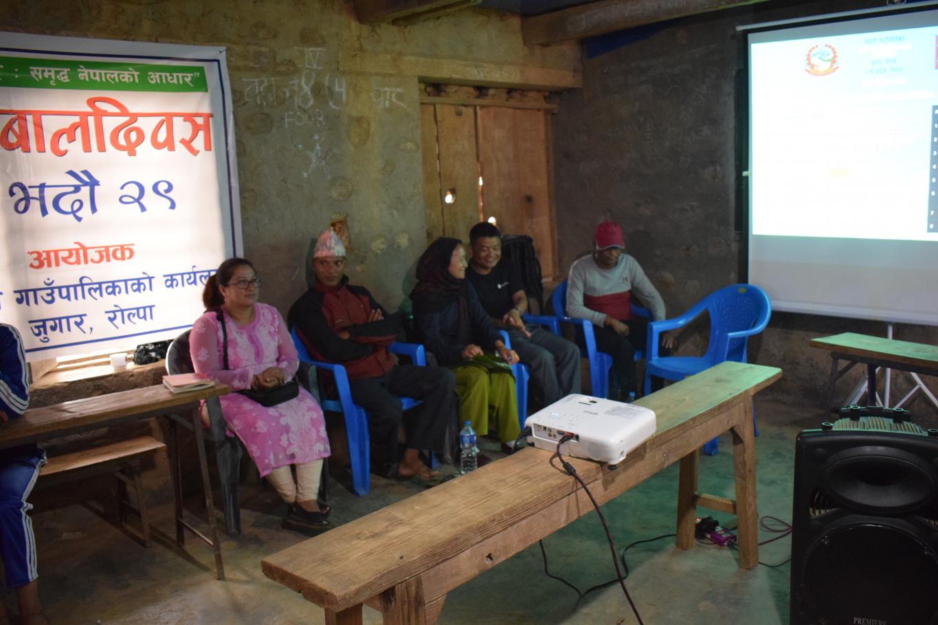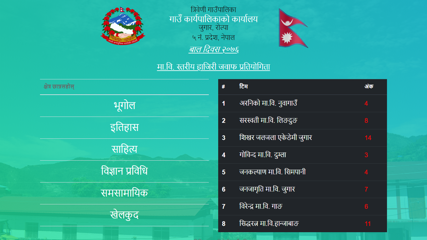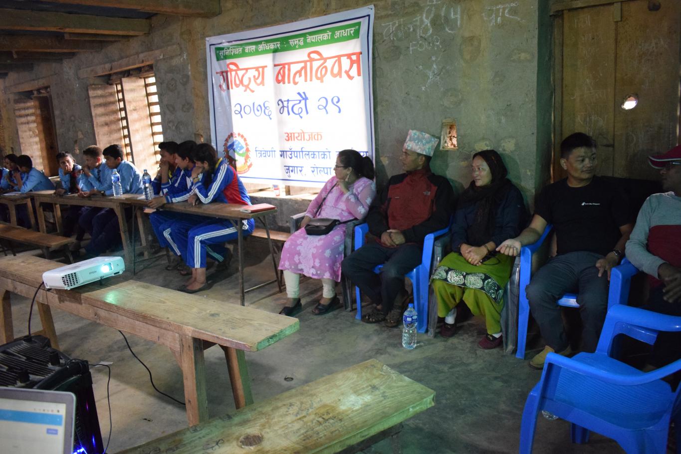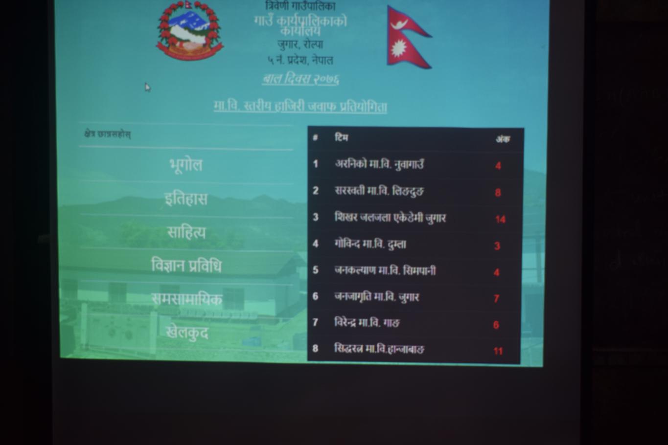 "सुनिश्चित बाल अधिकारः समृद्ध नेपालको आधार" नारा सहित राष्ट्रिय बाल दिवस २०७६ को अवसरमा अन्तर माध्यमिक विद्यालय स्तरीय हाजिरी जवाफ प्रतियोगिता सहित र््यालि तथा पुरस्कार वितरण कार्यक्रम संचालन गरियो । साथै हाजिरी जवाफ प्रतियोगिता प्रविधि मैत्री तथा बाल अधिकार सम्बन्धी विविध प्रश्नहरु समावेश गरि सम्पन्न गरियो ।